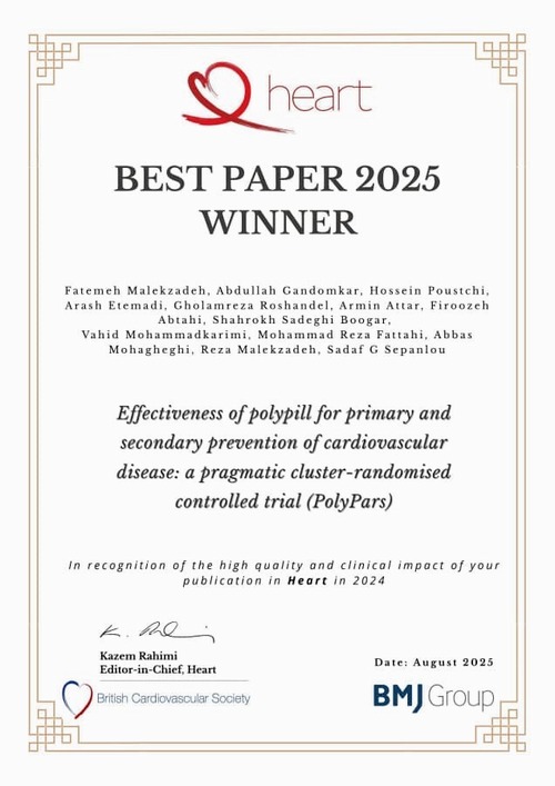 این مقاله برگزیده با عنوان "Effectiveness of polypill for primary and secondary prevention of cardiovascular disease: a pragmatic cluster-randomized controlled trial " به دلیل کیفیت بالا و تاثیر کلینیکی چشمگیر در زمینه پیشگیری از بیماری های قلبی-عروقی، شایسته این عنوان شناخته شده است.